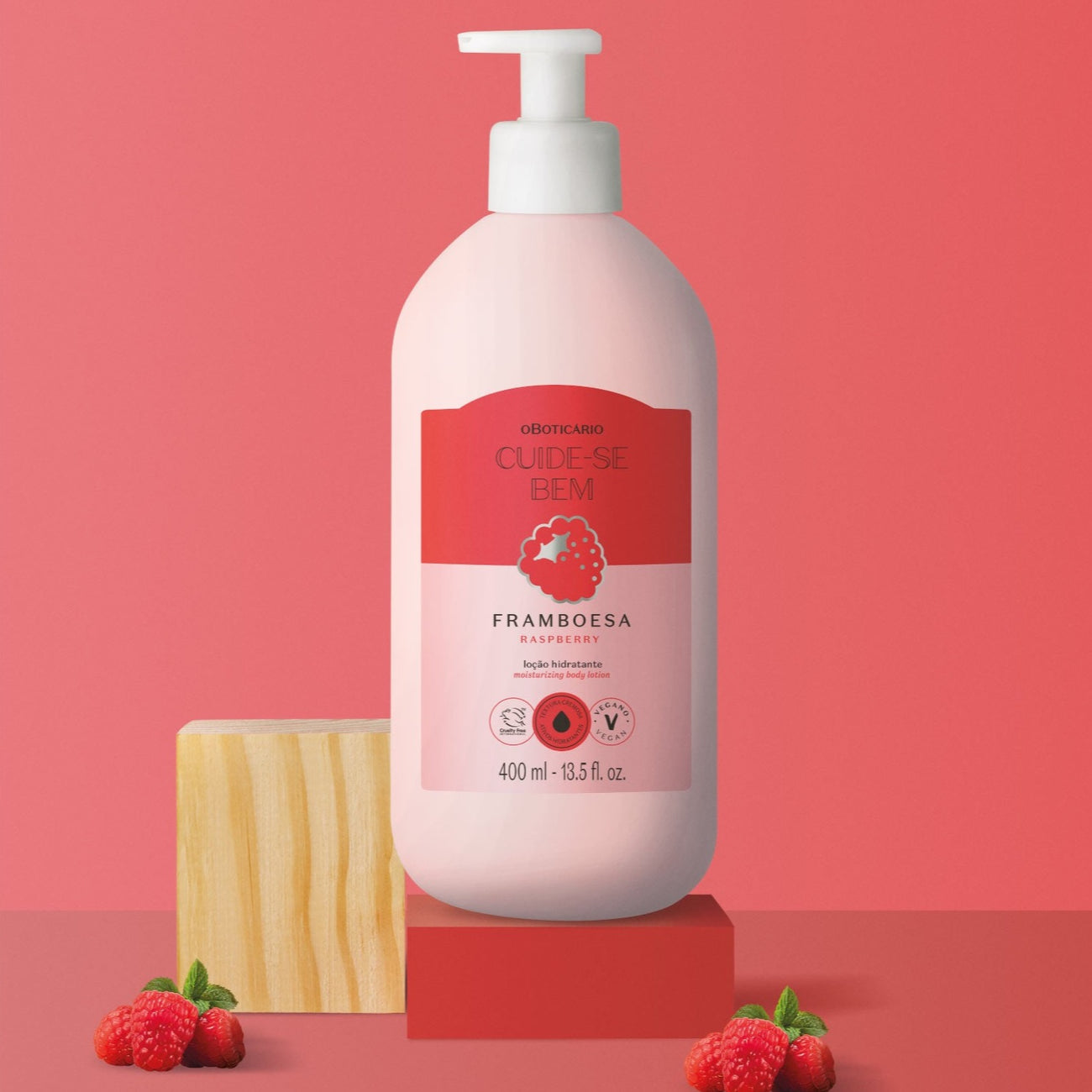 A Loção Hidratante Corporal Cuide-se Bem Feira Framboesa tem uma textura cremosa e um cheirinho suculento a framboesa. Com extrato da fruta* e ativos hidratantes, deixa a tua pele intensamente macia e perfumada. Com 96,6%** de ingredientes naturais, cuida de ti e do planeta.